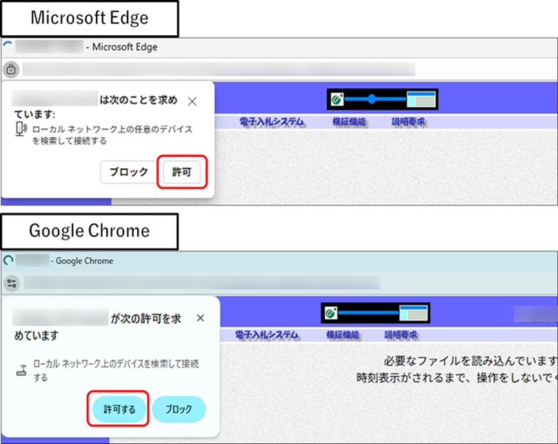 Microsoft EdgeまたはGoogle Chromeの最新バージョンを使用している場合、電子入札システムで下図のメッセージが表示されることがあります。